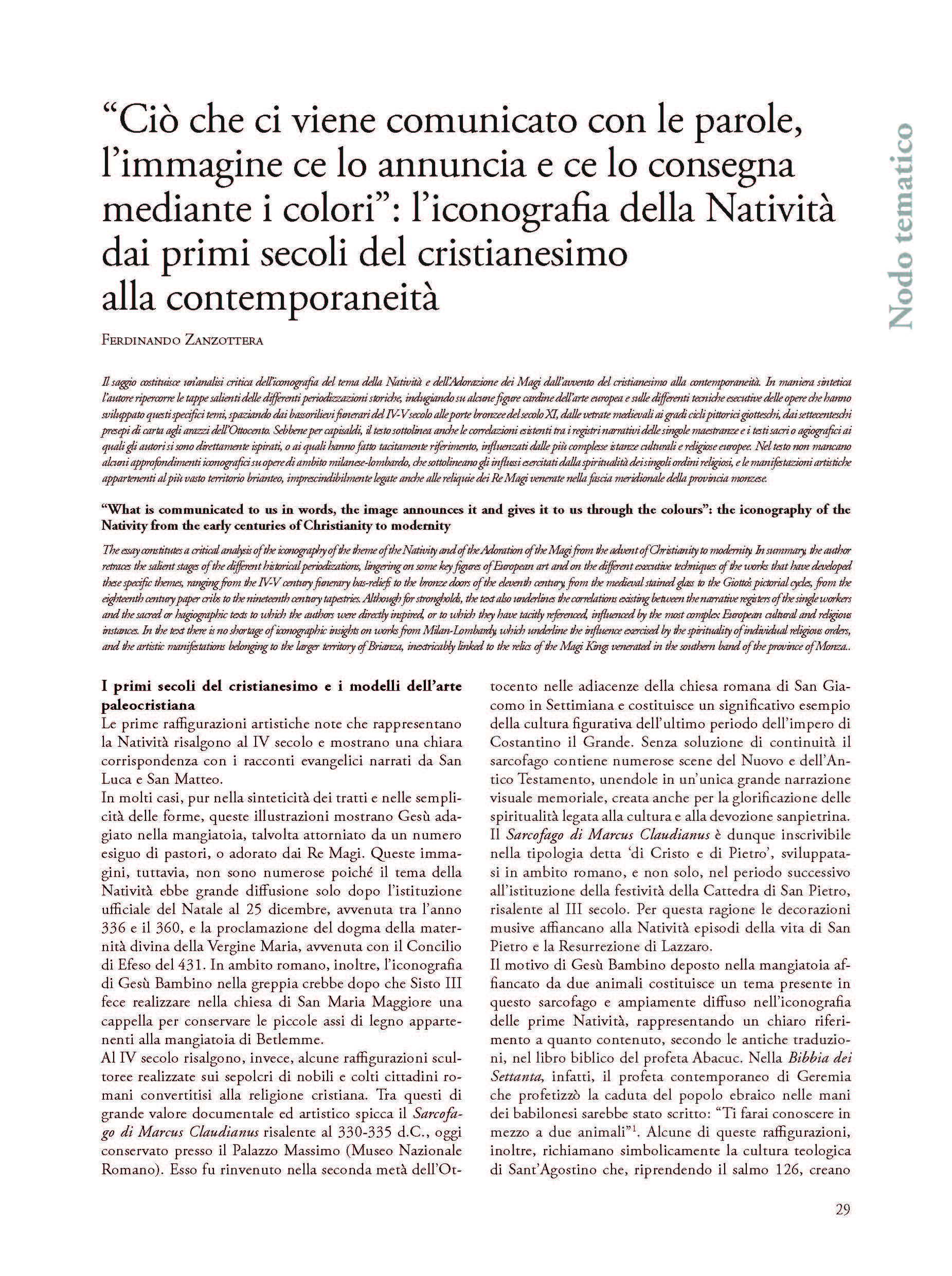 The essay constitutes a critical analysis of the iconography of the theme of the Nativity and of the Adoration of the Magi from the advent of Christianity to modernity. In summary, the author retraces the salient stages of the different historical periodizations, lingering on some key figures of European art and on the different executive techniques of the works that have developed these specific themes, ranging from the IV-V century funerary bas-reliefs to the bronze doors of the eleventh century, from the medieval stained glass to the Giotto’s pictorial cycles, from the eighteenth century paper cribs to the nineteenth century tapestries. Although for strongholds, the text also underlines the correlations existing between the narrative registers of the single workers and the sacred or hagiographic texts to which the authors were directly inspired, or to which they have tacitly referenced, influenced by the most complex European cultural and religious instances. In the text there is no shortage of iconographic insights on works from Milan-Lombardy, which underline the influence exercised by the spirituality of individual religious orders, and the artistic manifestations belonging to the larger territory of Brianza, inextricably linked to the relics of the Magi Kings venerated in the southern band of the province of Monza..